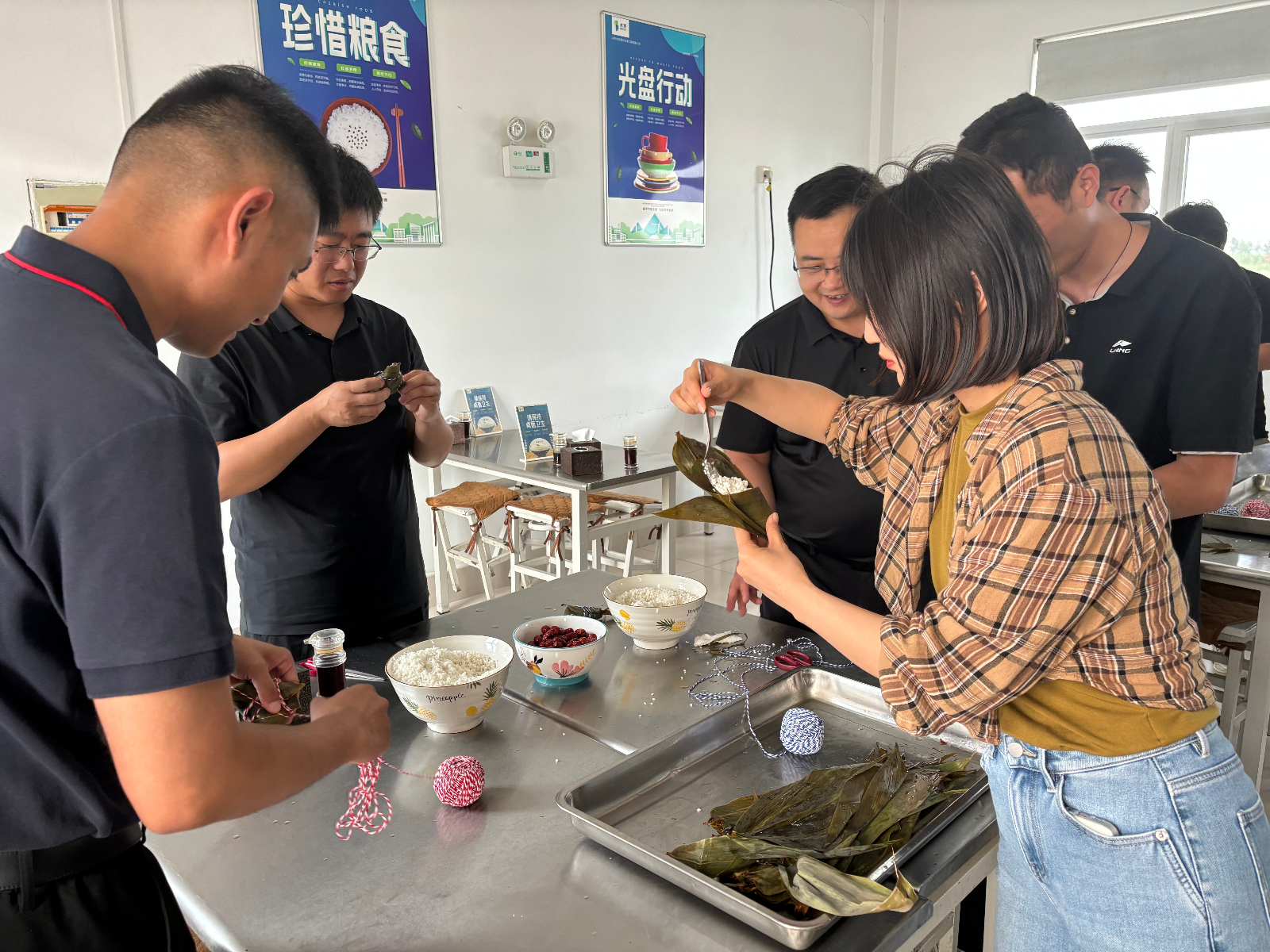 在一片祥和的節(jié)日氛圍中,大家圍攏在桌旁,邊學(xué)邊練,互相協(xié)作,折粽葉、填糯米、裹葉子、扎線.......一道道工序有條不紊,忙得不亦樂乎。一張張翠綠的粽葉在手中翩翩起舞一個個有模有樣的粽子迅速成型,大家手把手傳承著端午節(jié)的傳統(tǒng)文化,共同感受著中華傳統(tǒng)文化的魅力。