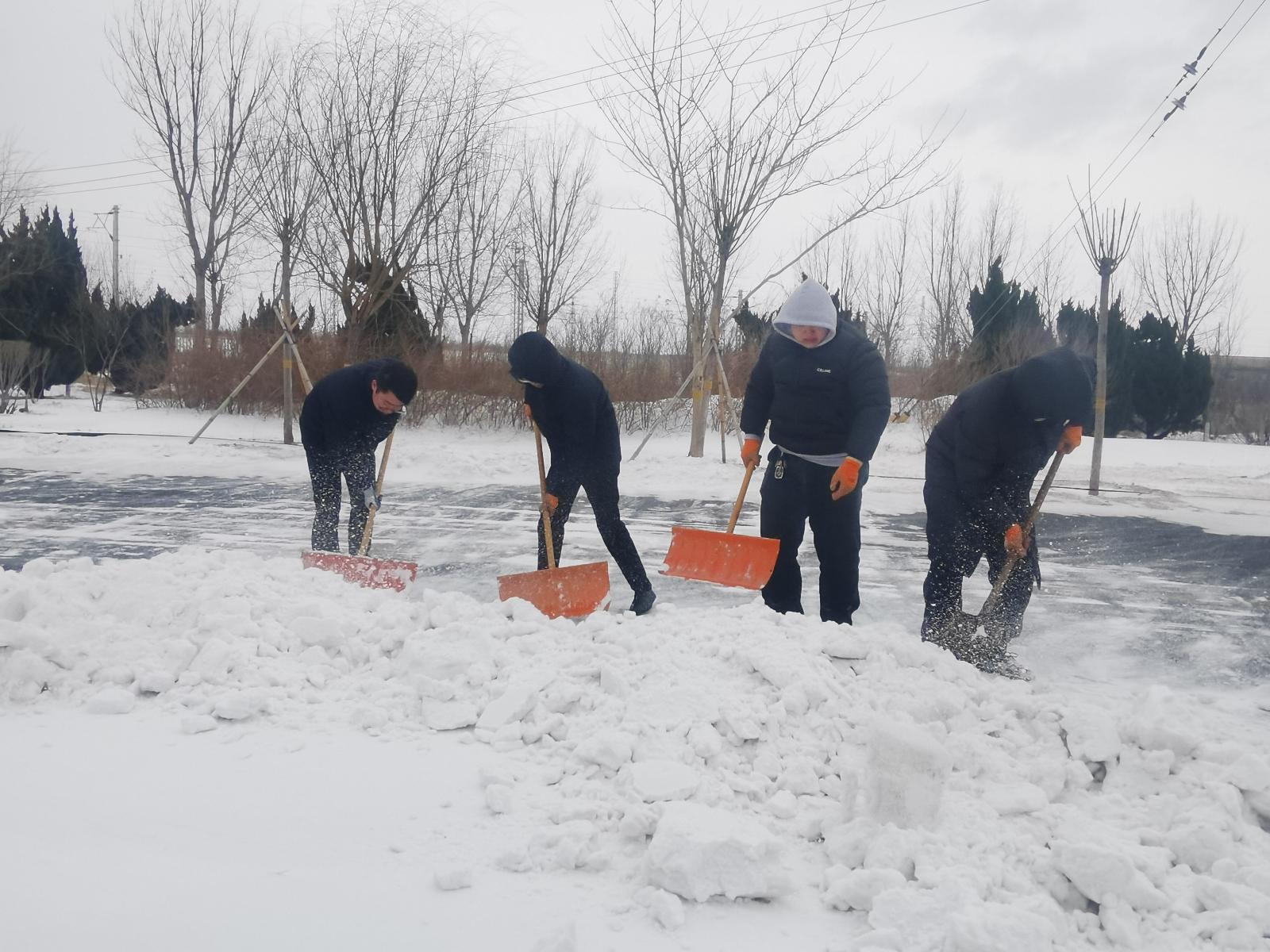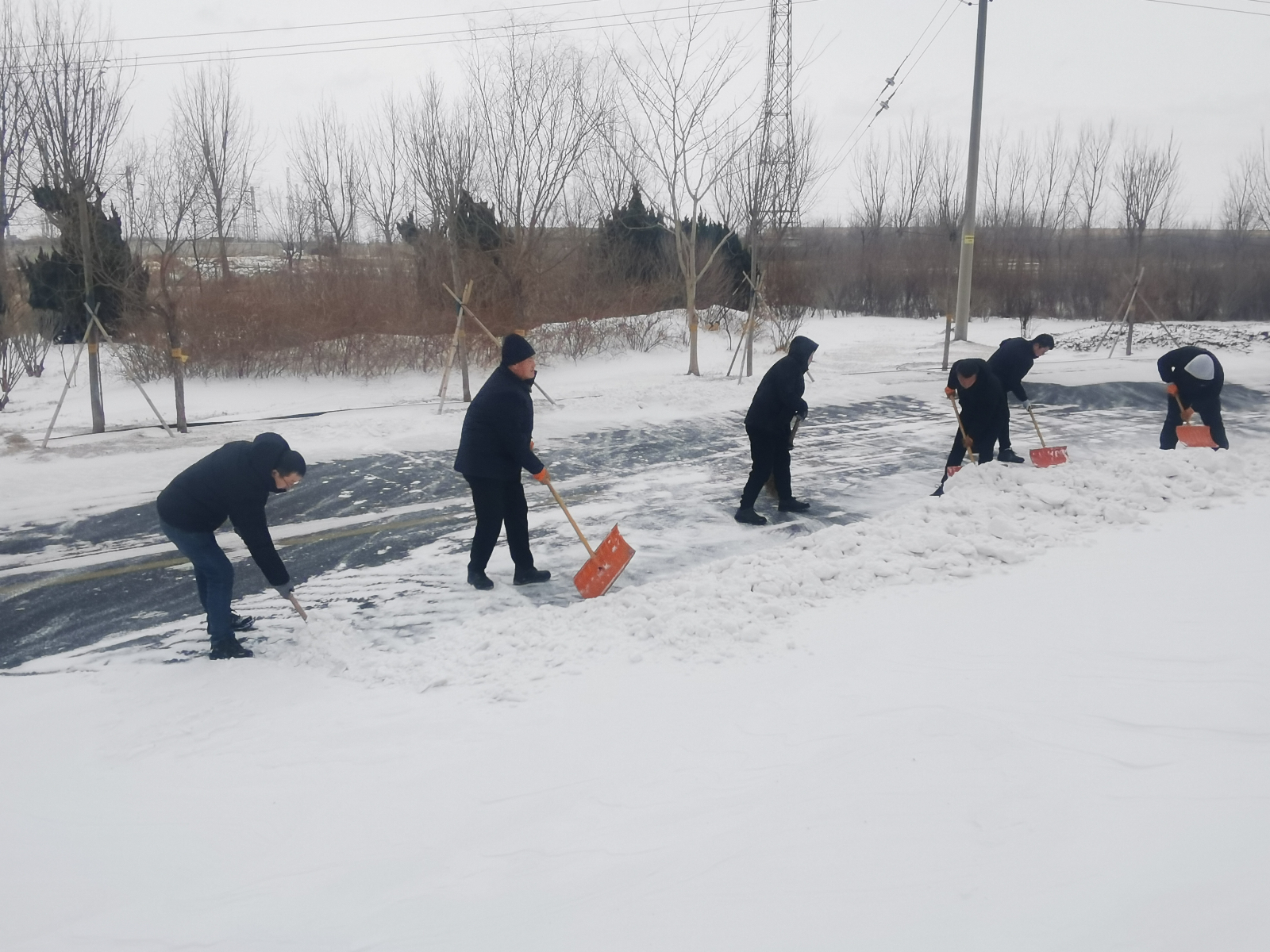 工作人員奮戰(zhàn)在除雪一線,頂風(fēng)冒雪、不懼嚴(yán)寒,手持掃帚、鐵鍬等除雪工具,認(rèn)真細(xì)致地清掃道路積雪,確保出行安全。