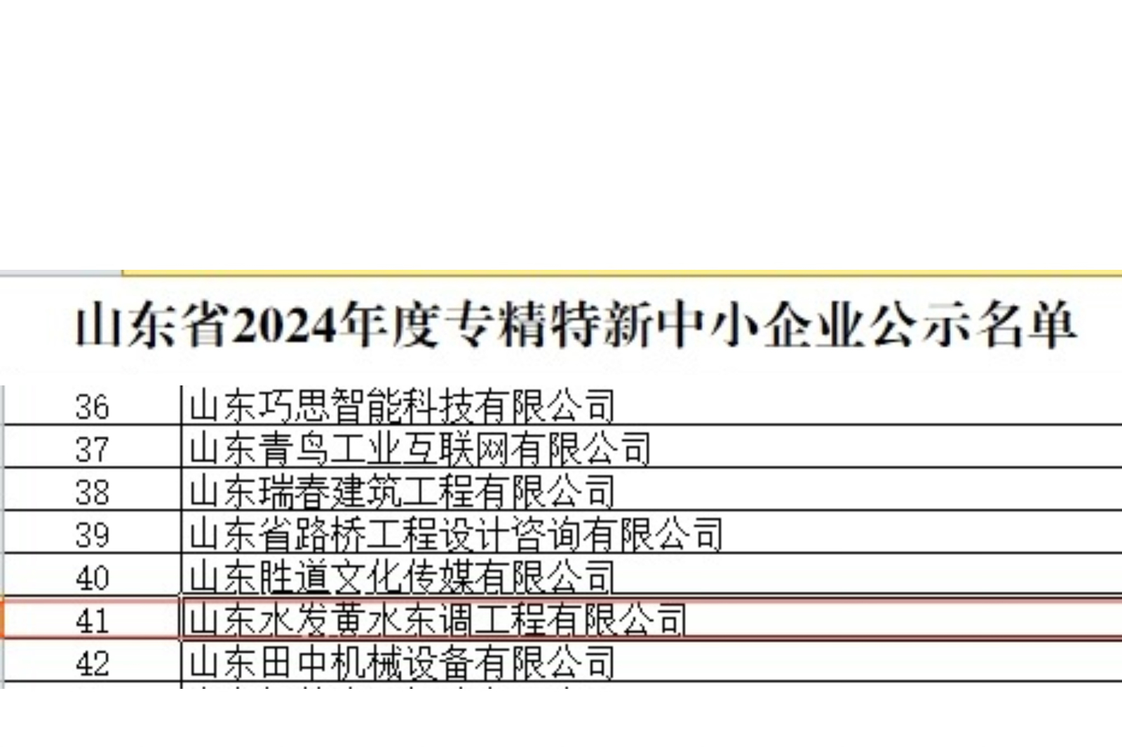 近日,山東省工業(yè)和信息化廳公示了山東省2024年度專(zhuān)精特新中小企業(yè)名單。經(jīng)自評(píng)申報(bào)、市級(jí)審核推薦、省級(jí)專(zhuān)家評(píng)審等程序,山東水發(fā)黃水東調(diào)工程有限公司進(jìn)入公示名單,順利通過(guò)山東省2024年度專(zhuān)精特新中小企業(yè)認(rèn)定。