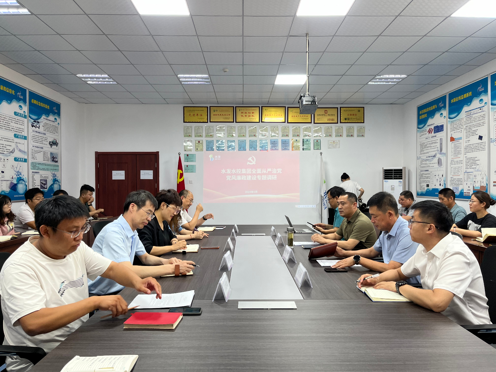 6月18日,水發(fā)水控集團(tuán)黨委委員、紀(jì)委書記王高升到濰坊河海水文科技有限公司開展全面從嚴(yán)治黨、黨風(fēng)廉政建設(shè)專題調(diào)研工作,水發(fā)水控集團(tuán)濰坊區(qū)域公司總經(jīng)理張勇主持調(diào)研會(huì)議,河海公司全體員工參加調(diào)研。